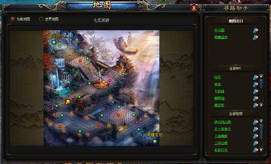 1.当前地图展示玩家所在地图的完整外貌,并在地图上显示各个出口与NPC的位置。